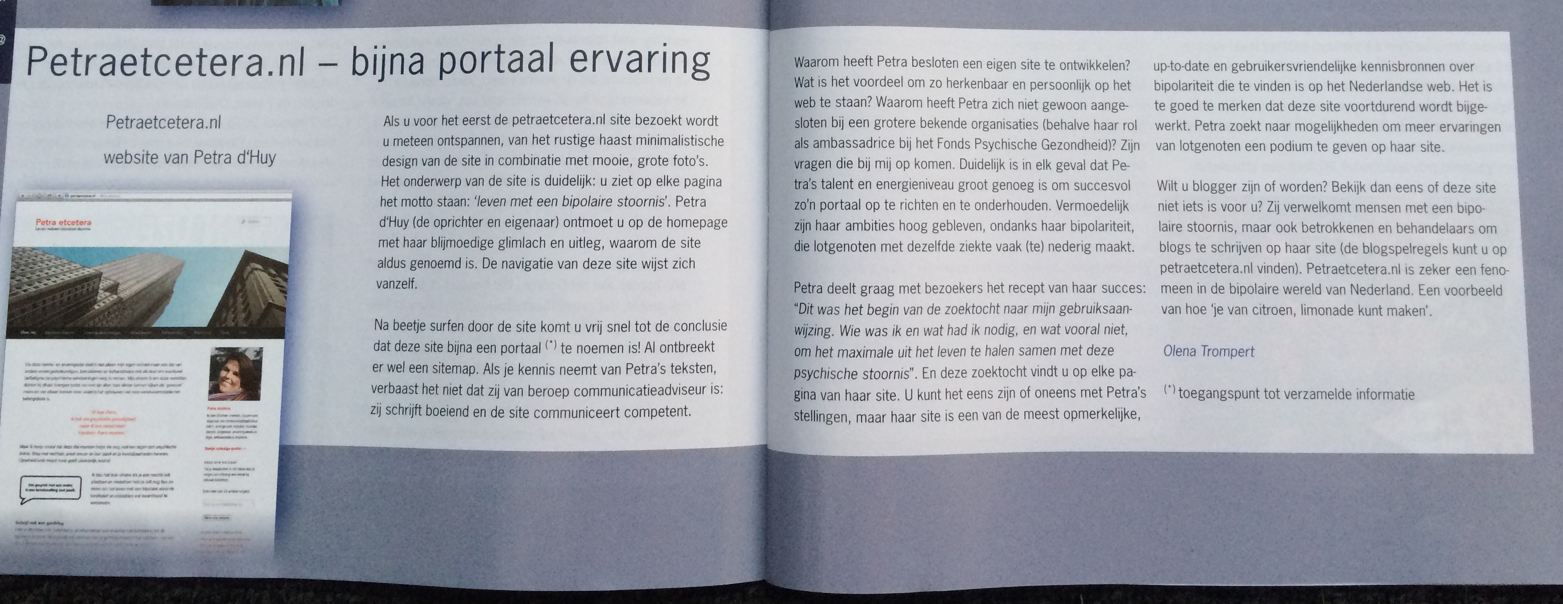 Wilt u blogger zijn of worden? Bekijk dan eens of deze site niet iets is voor u? Zij verwelkomt mensen met een bipolaire stoornis, maar ook betrokkenen en behandelaars om blogs te schrijven op haar site (de blogspelregels kunt u op petraetcetera.nl vinden). Petraetcetera.nl is zeker een fenomeen in de bipolaire wereld van Nederland. Een voorbeeld van hoe ‘je van citroen, limonade kunt maken’.
